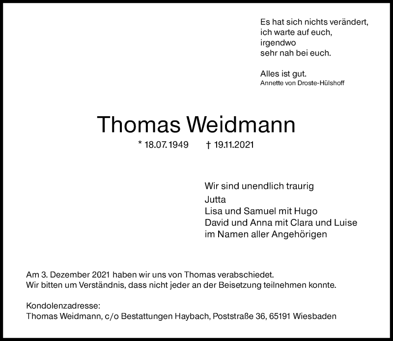 Hier finden Sie alle Traueranzeigen aus der Zeitung, die bisher für Thomas Weidmann erschienen sind. Weitere Traueranzeigen, die in der Zeitung erscheinen, werden hier ebenfalls aufgelistet