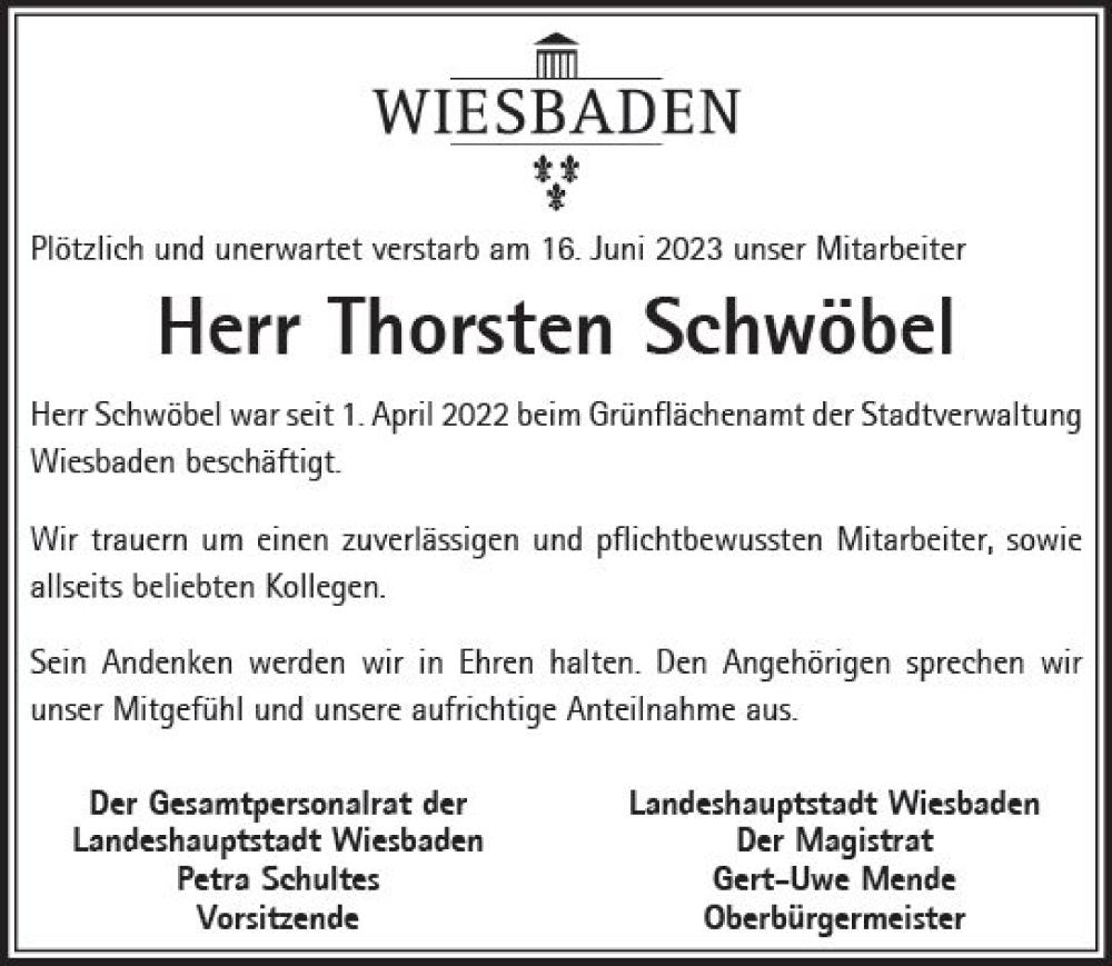 Hier finden Sie alle Traueranzeigen aus der Zeitung, die bisher für Thorsten Schwöbel erschienen sind. Weitere Traueranzeigen, die in der Zeitung erscheinen, werden hier ebenfalls aufgelistet