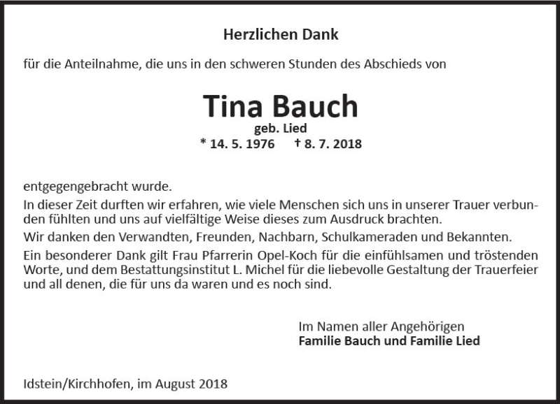 Hier finden Sie alle Traueranzeigen aus der Zeitung, die bisher für Tina Bauch erschienen sind. Weitere Traueranzeigen, die in der Zeitung erscheinen, werden hier ebenfalls aufgelistet
