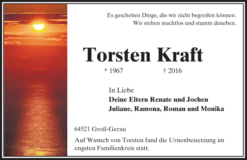 Hier finden Sie alle Traueranzeigen aus der Zeitung, die bisher für Torsten Kraft erschienen sind. Weitere Traueranzeigen, die in der Zeitung erscheinen, werden hier ebenfalls aufgelistet