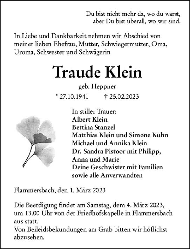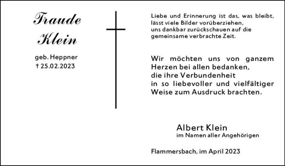 Hier finden Sie alle Traueranzeigen aus der Zeitung, die bisher für Traude Klein erschienen sind. Weitere Traueranzeigen, die in der Zeitung erscheinen, werden hier ebenfalls aufgelistet