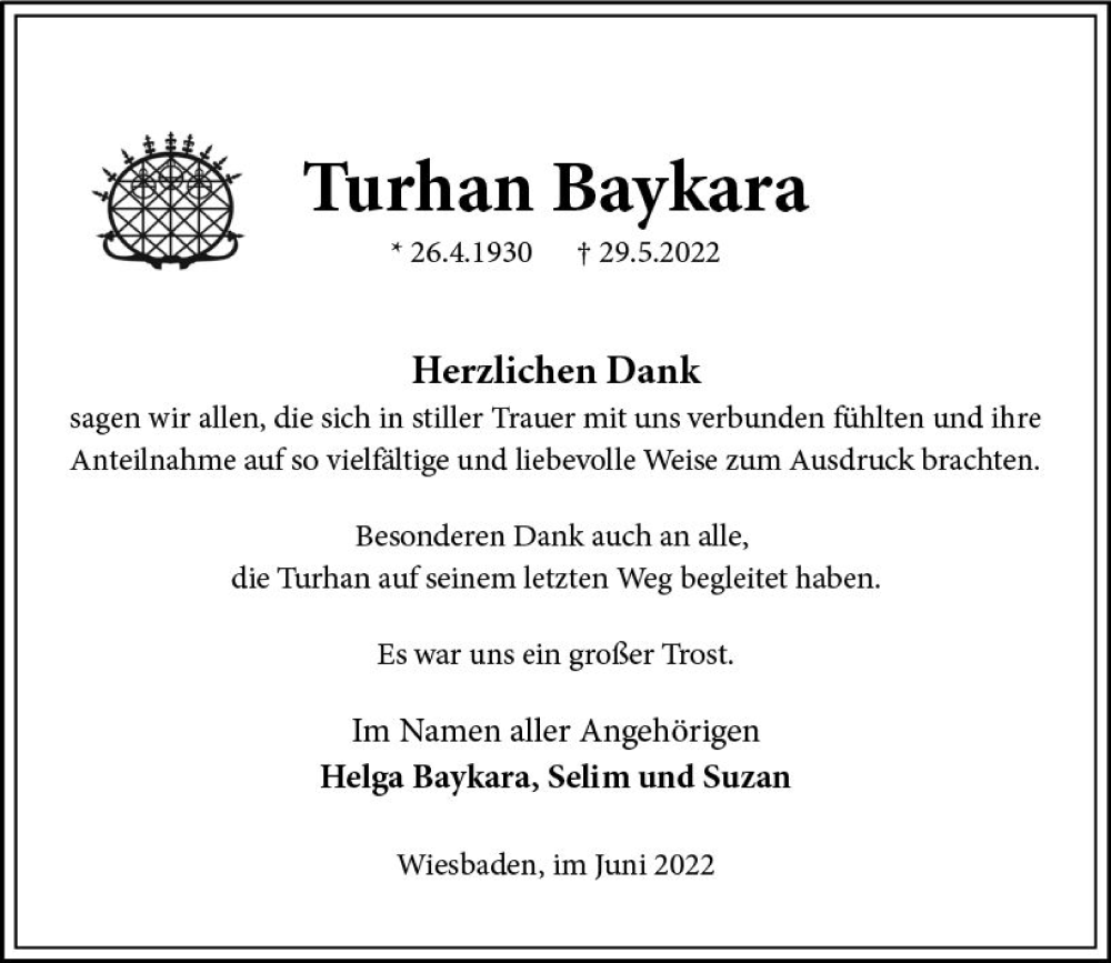 Hier finden Sie alle Traueranzeigen aus der Zeitung, die bisher für Turhan Baykara erschienen sind. Weitere Traueranzeigen, die in der Zeitung erscheinen, werden hier ebenfalls aufgelistet