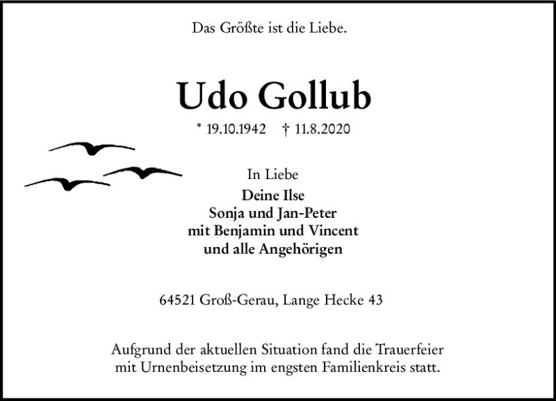 Hier finden Sie alle Traueranzeigen aus der Zeitung, die bisher für Udo Gollub erschienen sind. Weitere Traueranzeigen, die in der Zeitung erscheinen, werden hier ebenfalls aufgelistet