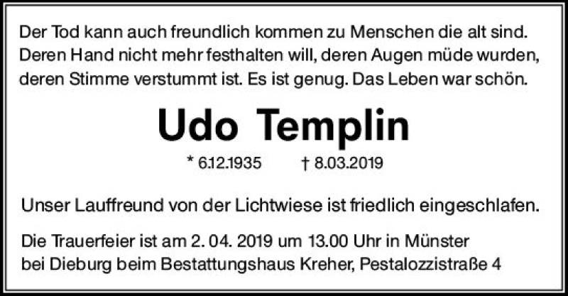 Hier finden Sie alle Traueranzeigen aus der Zeitung, die bisher für Udo Templin erschienen sind. Weitere Traueranzeigen, die in der Zeitung erscheinen, werden hier ebenfalls aufgelistet