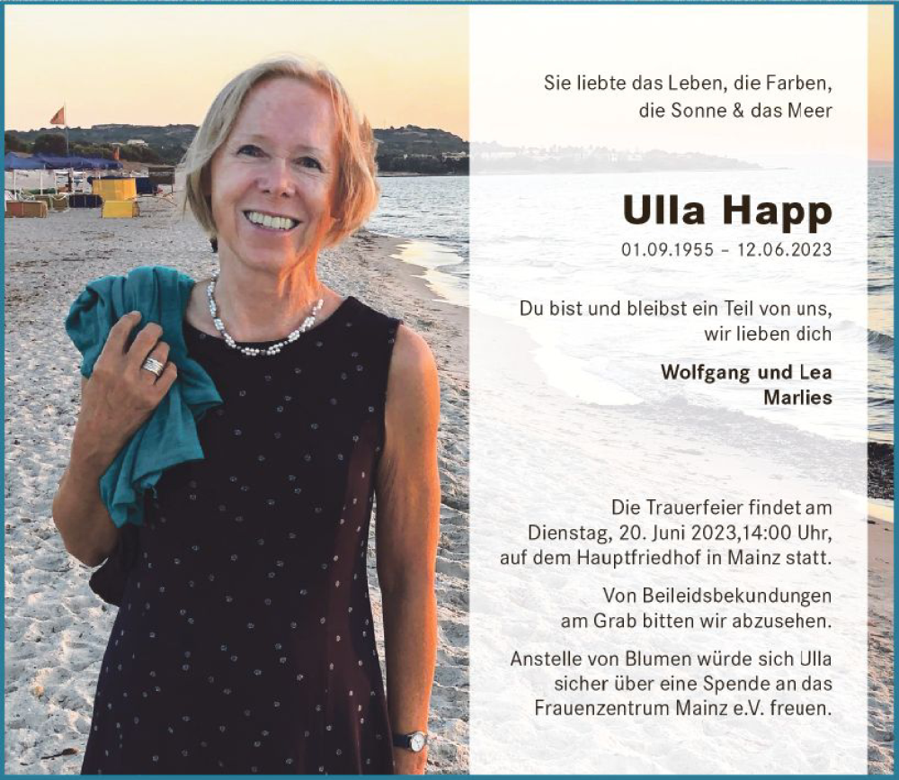 Hier finden Sie alle Traueranzeigen aus der Zeitung, die bisher für Ulla Happ erschienen sind. Weitere Traueranzeigen, die in der Zeitung erscheinen, werden hier ebenfalls aufgelistet