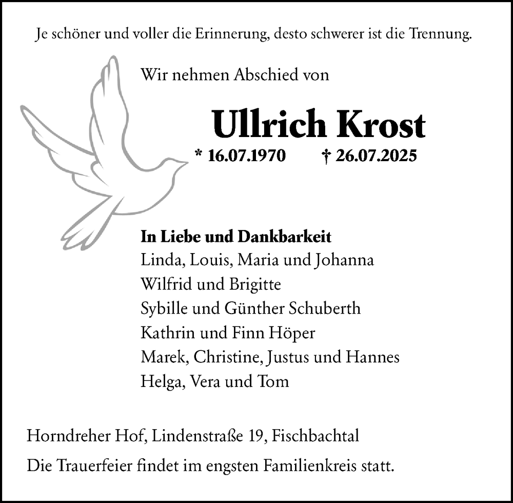 Hier finden Sie alle Traueranzeigen aus der Zeitung, die bisher für Ullrich Krost erschienen sind. Weitere Traueranzeigen, die in der Zeitung erscheinen, werden hier ebenfalls aufgelistet