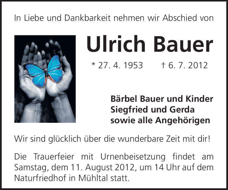 Hier finden Sie alle Traueranzeigen aus der Zeitung, die bisher für Ulrich Bauer erschienen sind. Weitere Traueranzeigen, die in der Zeitung erscheinen, werden hier ebenfalls aufgelistet