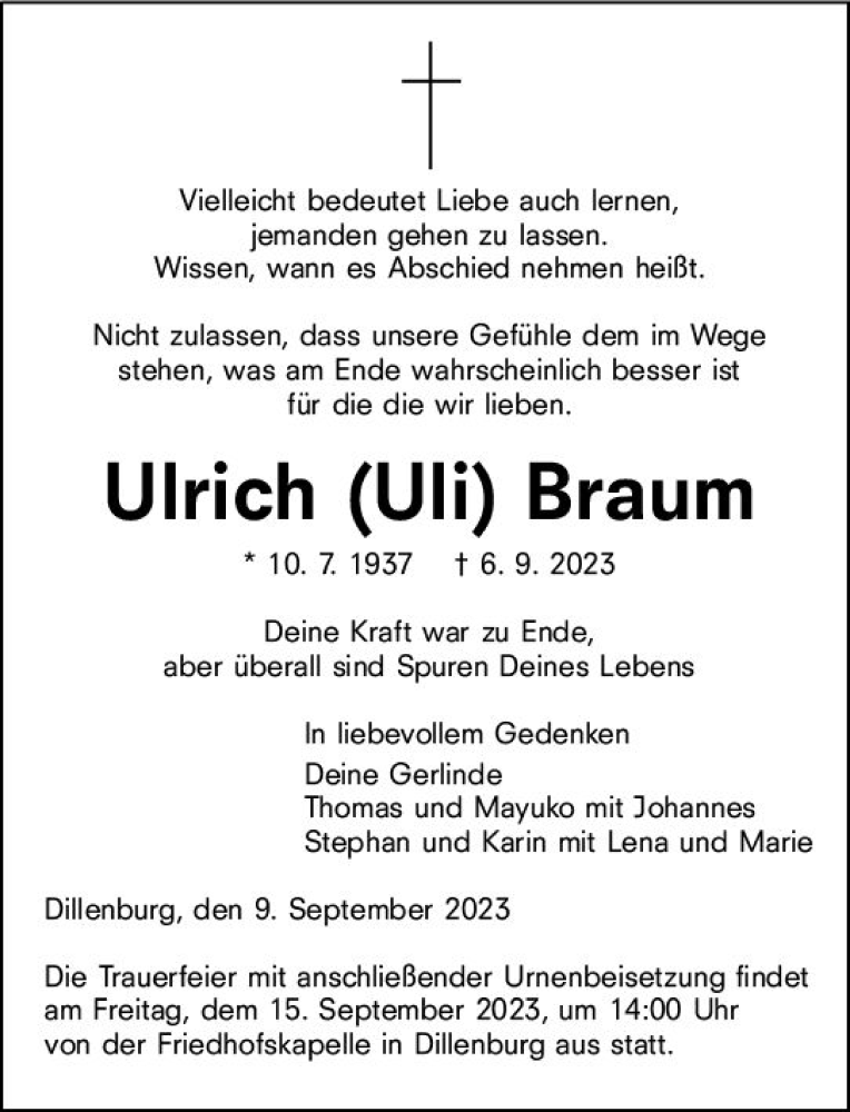 Hier finden Sie alle Traueranzeigen aus der Zeitung, die bisher für Ulrich Braum erschienen sind. Weitere Traueranzeigen, die in der Zeitung erscheinen, werden hier ebenfalls aufgelistet