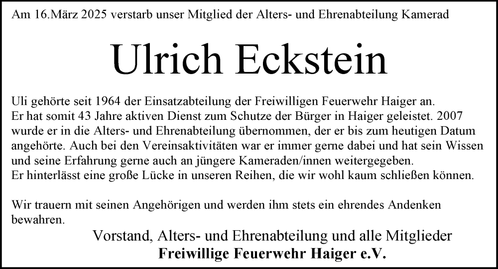 Hier finden Sie alle Traueranzeigen aus der Zeitung, die bisher für Ulrich Eckstein erschienen sind. Weitere Traueranzeigen, die in der Zeitung erscheinen, werden hier ebenfalls aufgelistet