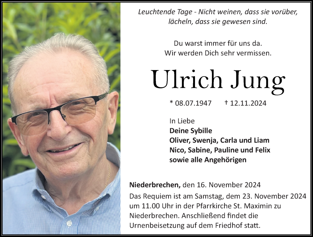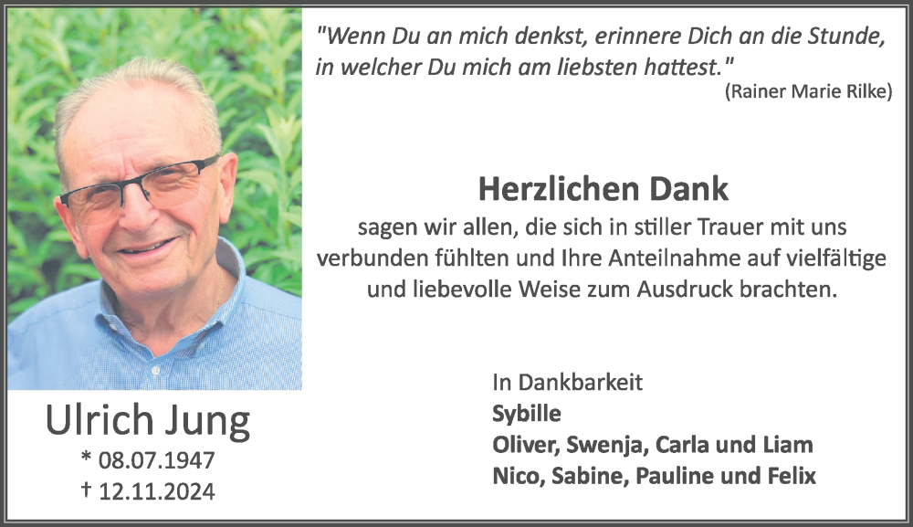 Hier finden Sie alle Traueranzeigen aus der Zeitung, die bisher für Ulrich Jung erschienen sind. Weitere Traueranzeigen, die in der Zeitung erscheinen, werden hier ebenfalls aufgelistet