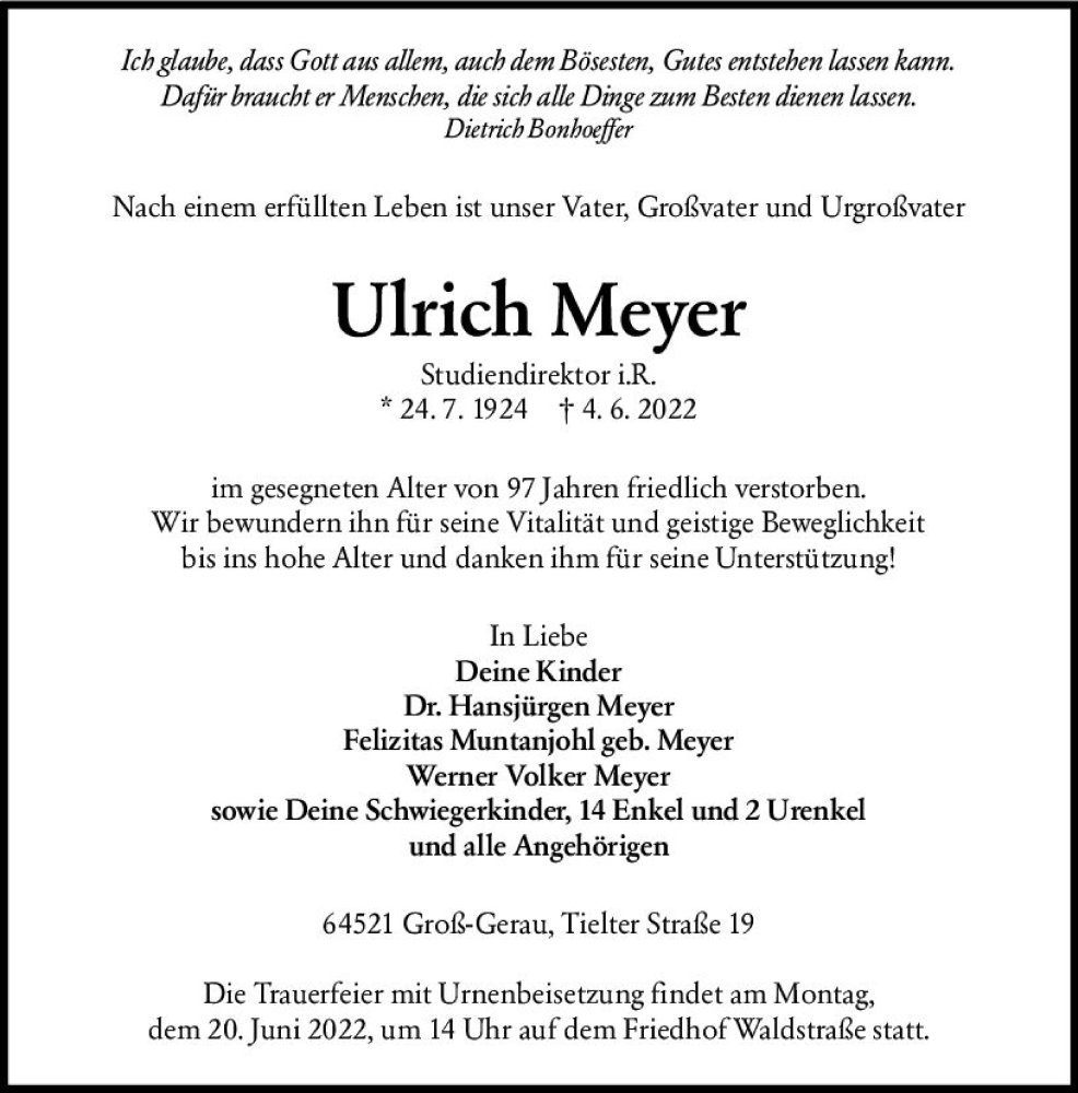 Hier finden Sie alle Traueranzeigen aus der Zeitung, die bisher für Ulrich Meyer erschienen sind. Weitere Traueranzeigen, die in der Zeitung erscheinen, werden hier ebenfalls aufgelistet
