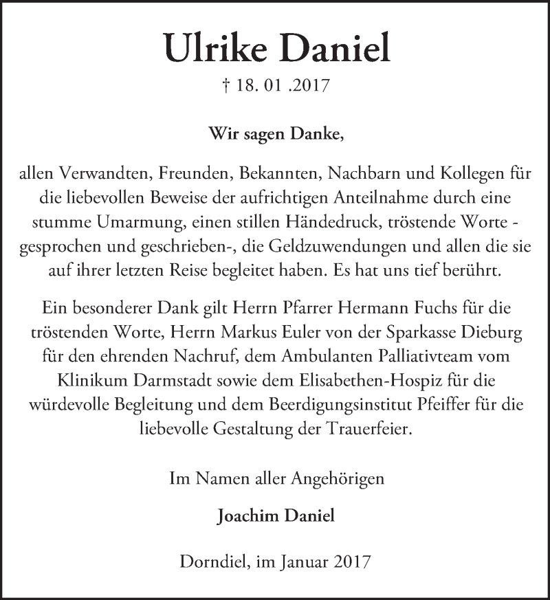 Hier finden Sie alle Traueranzeigen aus der Zeitung, die bisher für Ulrike Daniel erschienen sind. Weitere Traueranzeigen, die in der Zeitung erscheinen, werden hier ebenfalls aufgelistet