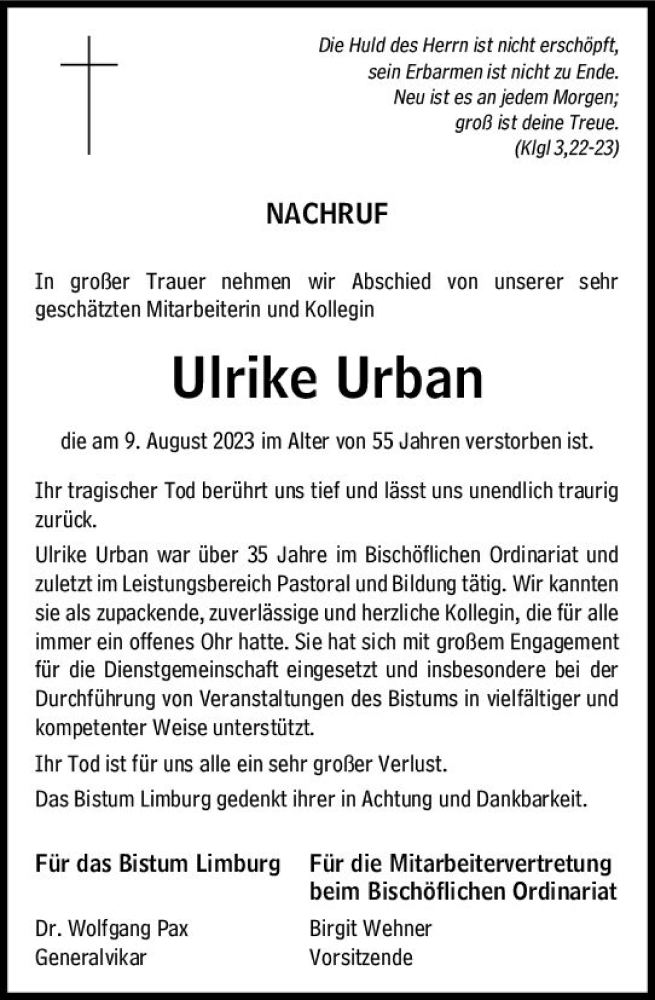 Hier finden Sie alle Traueranzeigen aus der Zeitung, die bisher für Ulrike Urban erschienen sind. Weitere Traueranzeigen, die in der Zeitung erscheinen, werden hier ebenfalls aufgelistet