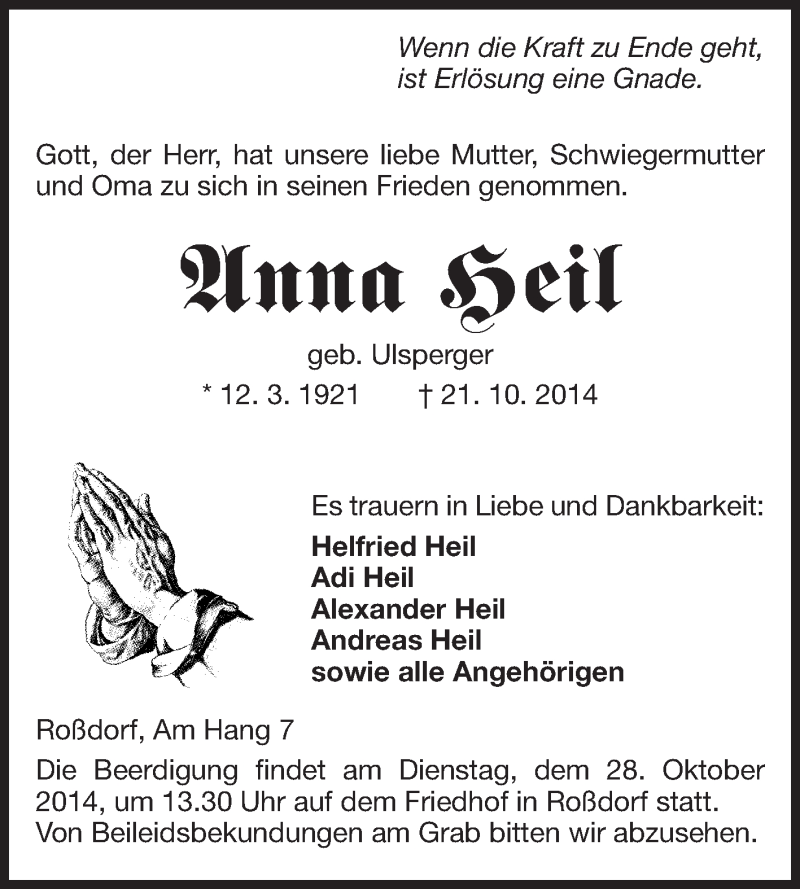 Hier finden Sie alle Traueranzeigen aus der Zeitung, die bisher für Unna Seil erschienen sind. Weitere Traueranzeigen, die in der Zeitung erscheinen, werden hier ebenfalls aufgelistet