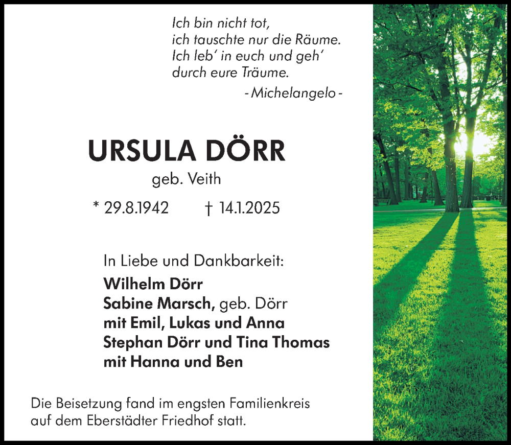 Hier finden Sie alle Traueranzeigen aus der Zeitung, die bisher für Ursula Dörr erschienen sind. Weitere Traueranzeigen, die in der Zeitung erscheinen, werden hier ebenfalls aufgelistet