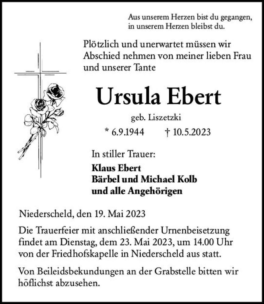 Hier finden Sie alle Traueranzeigen aus der Zeitung, die bisher für Ursula Ebert erschienen sind. Weitere Traueranzeigen, die in der Zeitung erscheinen, werden hier ebenfalls aufgelistet