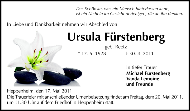 Hier finden Sie alle Traueranzeigen aus der Zeitung, die bisher für Ursula Fürstenberg erschienen sind. Weitere Traueranzeigen, die in der Zeitung erscheinen, werden hier ebenfalls aufgelistet