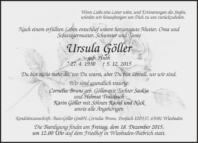 Hier finden Sie alle Traueranzeigen aus der Zeitung, die bisher für Ursula Göller erschienen sind. Weitere Traueranzeigen, die in der Zeitung erscheinen, werden hier ebenfalls aufgelistet