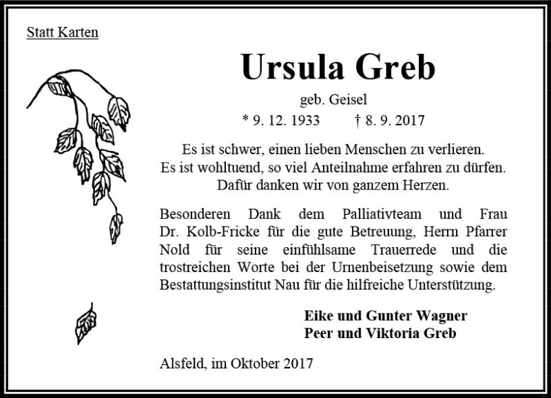 Hier finden Sie alle Traueranzeigen aus der Zeitung, die bisher für Ursula Greb erschienen sind. Weitere Traueranzeigen, die in der Zeitung erscheinen, werden hier ebenfalls aufgelistet