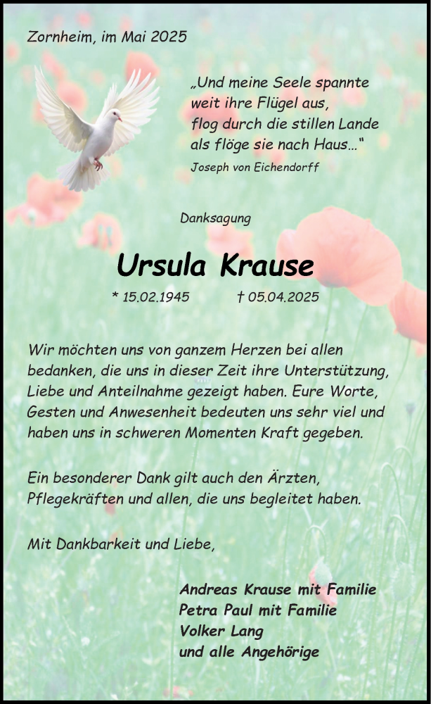 Hier finden Sie alle Traueranzeigen aus der Zeitung, die bisher für Ursula Krause erschienen sind. Weitere Traueranzeigen, die in der Zeitung erscheinen, werden hier ebenfalls aufgelistet