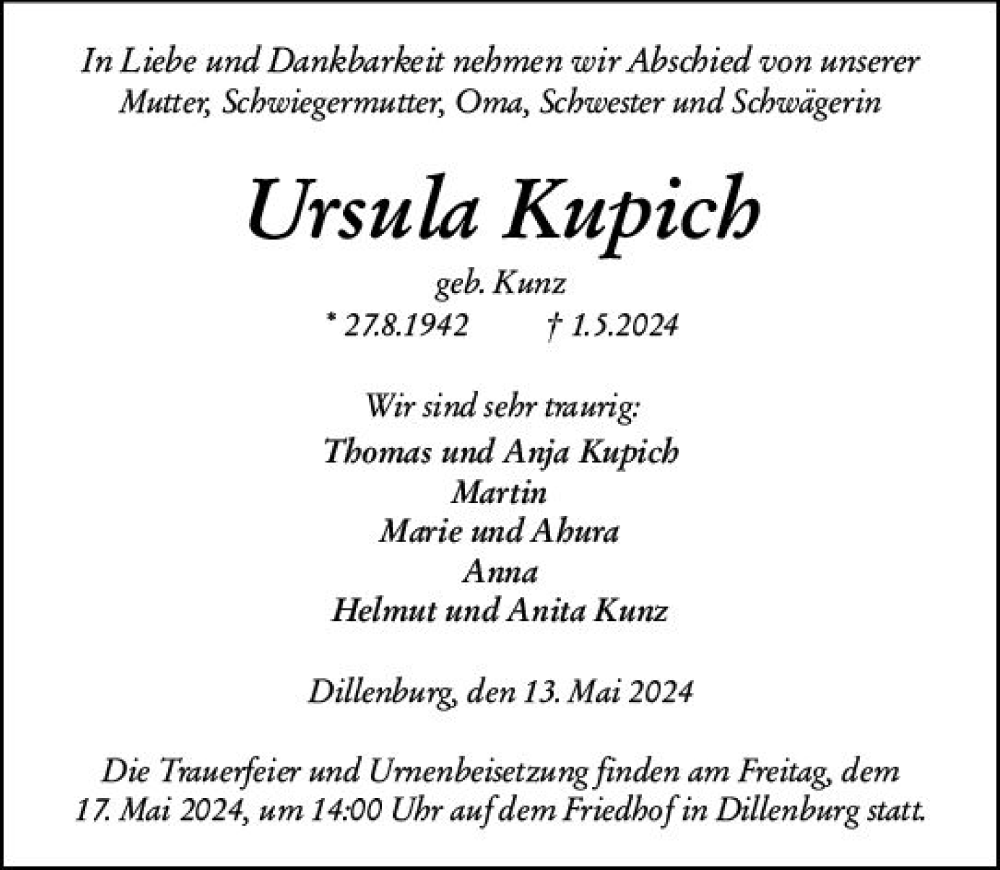 Hier finden Sie alle Traueranzeigen aus der Zeitung, die bisher für Ursula Kupich erschienen sind. Weitere Traueranzeigen, die in der Zeitung erscheinen, werden hier ebenfalls aufgelistet