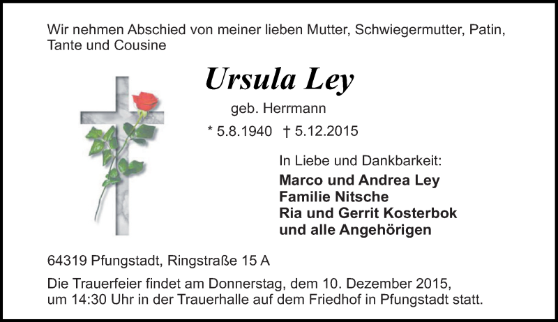 Hier finden Sie alle Traueranzeigen aus der Zeitung, die bisher für Ursula Ley erschienen sind. Weitere Traueranzeigen, die in der Zeitung erscheinen, werden hier ebenfalls aufgelistet