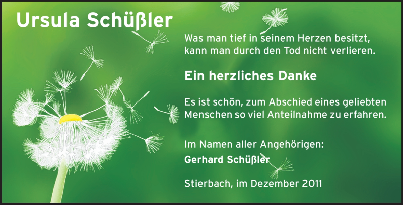 Hier finden Sie alle Traueranzeigen aus der Zeitung, die bisher für Ursula Schüßler erschienen sind. Weitere Traueranzeigen, die in der Zeitung erscheinen, werden hier ebenfalls aufgelistet