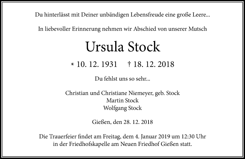 Hier finden Sie alle Traueranzeigen aus der Zeitung, die bisher für Ursula Stock erschienen sind. Weitere Traueranzeigen, die in der Zeitung erscheinen, werden hier ebenfalls aufgelistet