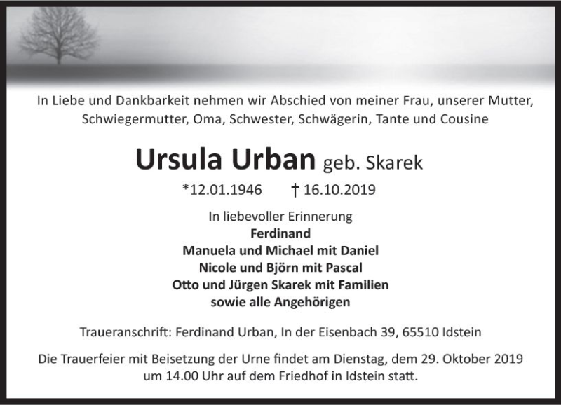 Hier finden Sie alle Traueranzeigen aus der Zeitung, die bisher für Ursula Urban erschienen sind. Weitere Traueranzeigen, die in der Zeitung erscheinen, werden hier ebenfalls aufgelistet