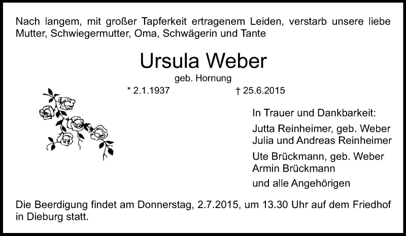 Hier finden Sie alle Traueranzeigen aus der Zeitung, die bisher für Ursula Weber erschienen sind. Weitere Traueranzeigen, die in der Zeitung erscheinen, werden hier ebenfalls aufgelistet