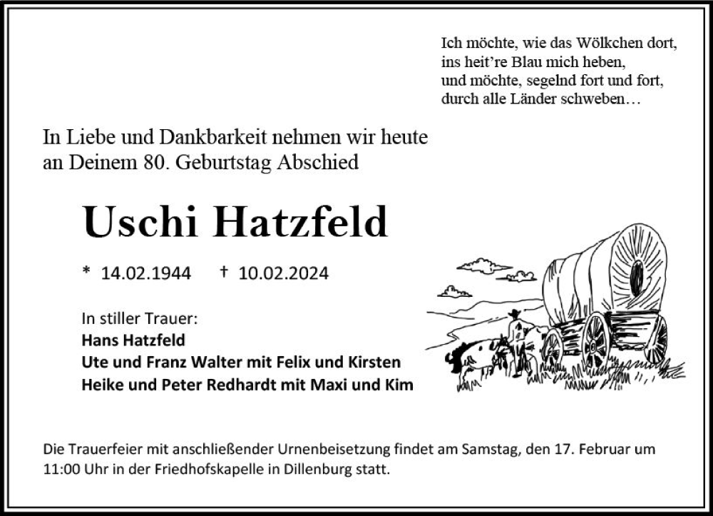 Hier finden Sie alle Traueranzeigen aus der Zeitung, die bisher für Uschi Hatzfeld erschienen sind. Weitere Traueranzeigen, die in der Zeitung erscheinen, werden hier ebenfalls aufgelistet