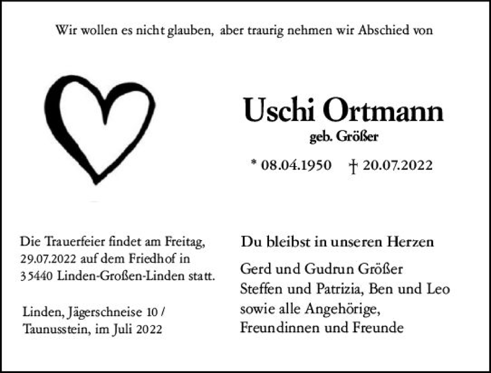 Hier finden Sie alle Traueranzeigen aus der Zeitung, die bisher für Uschi Ortmann erschienen sind. Weitere Traueranzeigen, die in der Zeitung erscheinen, werden hier ebenfalls aufgelistet