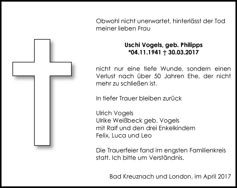 Hier finden Sie alle Traueranzeigen aus der Zeitung, die bisher für Uschi Vogels erschienen sind. Weitere Traueranzeigen, die in der Zeitung erscheinen, werden hier ebenfalls aufgelistet
