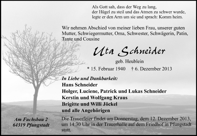 Hier finden Sie alle Traueranzeigen aus der Zeitung, die bisher für Uta Schneider erschienen sind. Weitere Traueranzeigen, die in der Zeitung erscheinen, werden hier ebenfalls aufgelistet