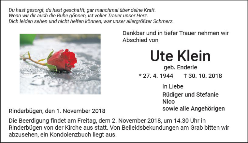 Hier finden Sie alle Traueranzeigen aus der Zeitung, die bisher für Ute Klein erschienen sind. Weitere Traueranzeigen, die in der Zeitung erscheinen, werden hier ebenfalls aufgelistet