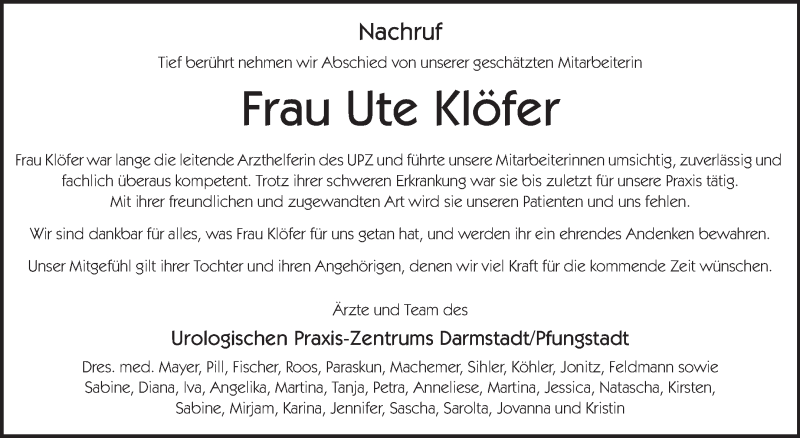 Hier finden Sie alle Traueranzeigen aus der Zeitung, die bisher für Ute Klöfer erschienen sind. Weitere Traueranzeigen, die in der Zeitung erscheinen, werden hier ebenfalls aufgelistet