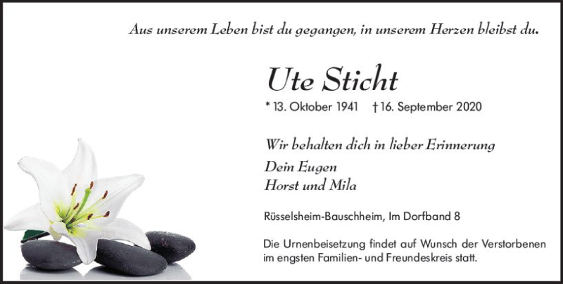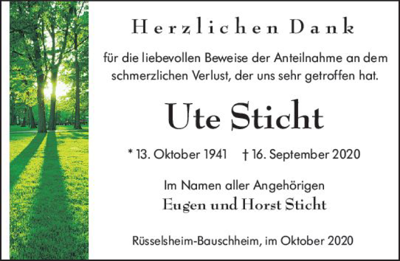 Hier finden Sie alle Traueranzeigen aus der Zeitung, die bisher für Ute Sticht erschienen sind. Weitere Traueranzeigen, die in der Zeitung erscheinen, werden hier ebenfalls aufgelistet