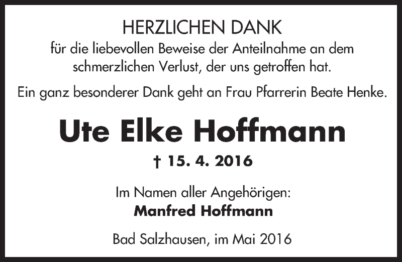 Hier finden Sie alle Traueranzeigen aus der Zeitung, die bisher für Ute Elke Hoffmann erschienen sind. Weitere Traueranzeigen, die in der Zeitung erscheinen, werden hier ebenfalls aufgelistet