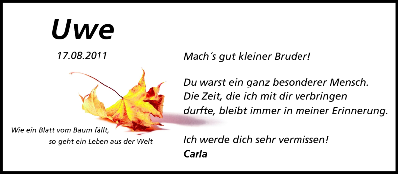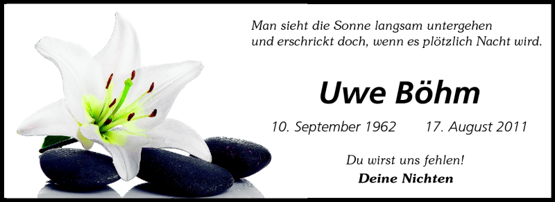 Hier finden Sie alle Traueranzeigen aus der Zeitung, die bisher für Uwe Böhm erschienen sind. Weitere Traueranzeigen, die in der Zeitung erscheinen, werden hier ebenfalls aufgelistet