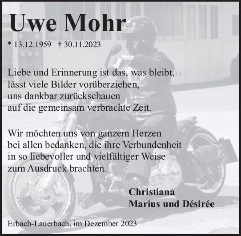 Hier finden Sie alle Traueranzeigen aus der Zeitung, die bisher für Uwe Mohr erschienen sind. Weitere Traueranzeigen, die in der Zeitung erscheinen, werden hier ebenfalls aufgelistet