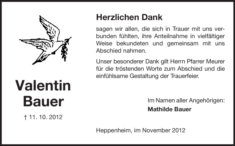 Hier finden Sie alle Traueranzeigen aus der Zeitung, die bisher für Valentin Bauer erschienen sind. Weitere Traueranzeigen, die in der Zeitung erscheinen, werden hier ebenfalls aufgelistet