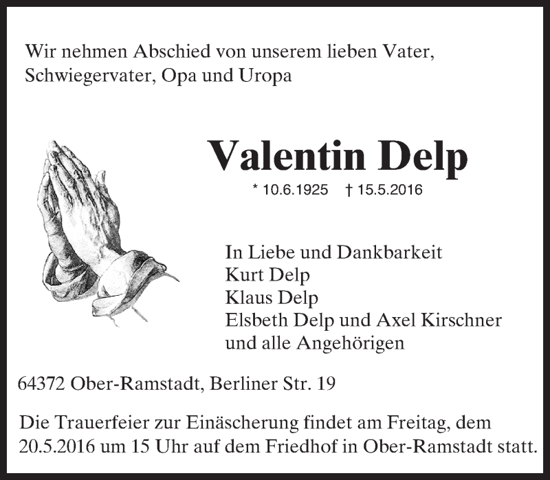 Hier finden Sie alle Traueranzeigen aus der Zeitung, die bisher für Valentin Delp erschienen sind. Weitere Traueranzeigen, die in der Zeitung erscheinen, werden hier ebenfalls aufgelistet