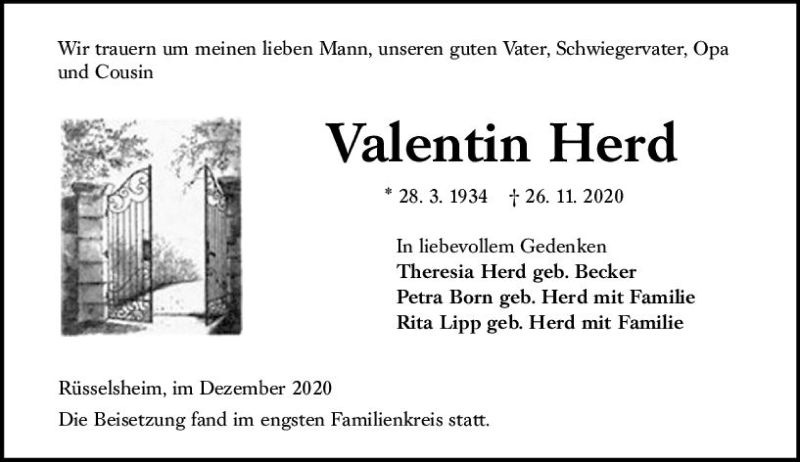 Hier finden Sie alle Traueranzeigen aus der Zeitung, die bisher für Valentin Herd erschienen sind. Weitere Traueranzeigen, die in der Zeitung erscheinen, werden hier ebenfalls aufgelistet