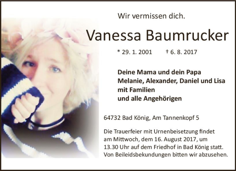 Hier finden Sie alle Traueranzeigen aus der Zeitung, die bisher für Vanessa Baumrucker erschienen sind. Weitere Traueranzeigen, die in der Zeitung erscheinen, werden hier ebenfalls aufgelistet