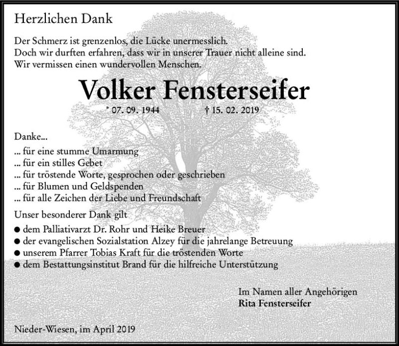 Hier finden Sie alle Traueranzeigen aus der Zeitung, die bisher für Volker Fensterseifer erschienen sind. Weitere Traueranzeigen, die in der Zeitung erscheinen, werden hier ebenfalls aufgelistet