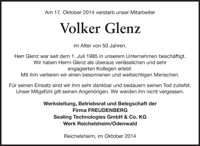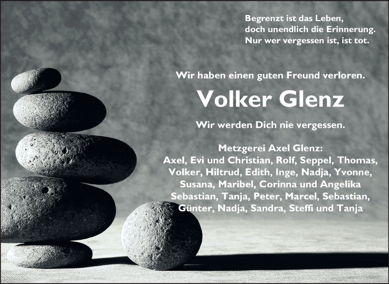Hier finden Sie alle Traueranzeigen aus der Zeitung, die bisher für Volker Glenz erschienen sind. Weitere Traueranzeigen, die in der Zeitung erscheinen, werden hier ebenfalls aufgelistet