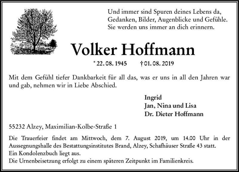 Hier finden Sie alle Traueranzeigen aus der Zeitung, die bisher für Volker Hoffmann erschienen sind. Weitere Traueranzeigen, die in der Zeitung erscheinen, werden hier ebenfalls aufgelistet