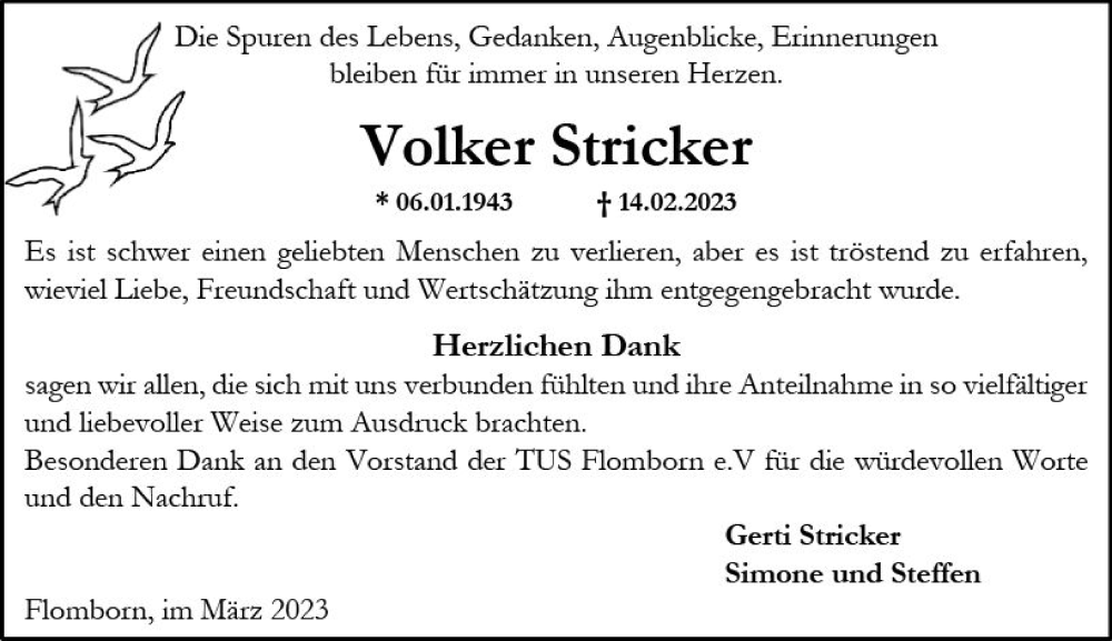 Hier finden Sie alle Traueranzeigen aus der Zeitung, die bisher für Volker Stricker erschienen sind. Weitere Traueranzeigen, die in der Zeitung erscheinen, werden hier ebenfalls aufgelistet