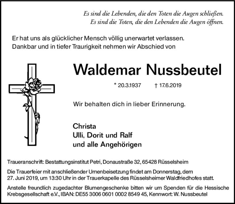 Hier finden Sie alle Traueranzeigen aus der Zeitung, die bisher für Waldemar Nussbeutel erschienen sind. Weitere Traueranzeigen, die in der Zeitung erscheinen, werden hier ebenfalls aufgelistet