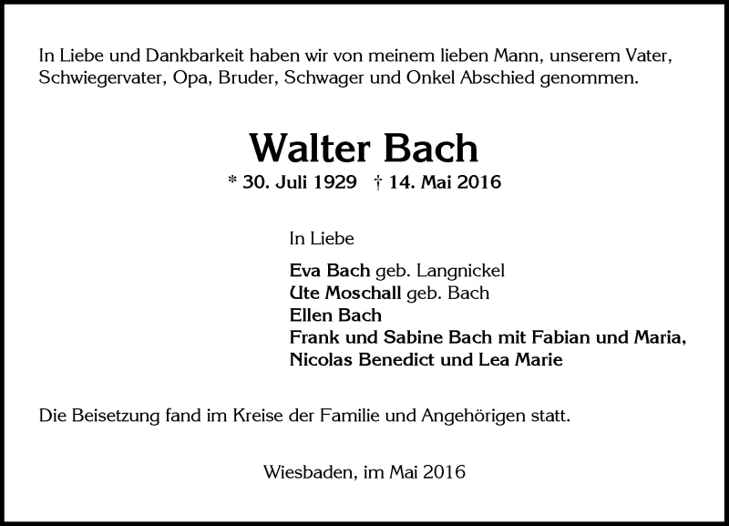 Hier finden Sie alle Traueranzeigen aus der Zeitung, die bisher für Walter Bach erschienen sind. Weitere Traueranzeigen, die in der Zeitung erscheinen, werden hier ebenfalls aufgelistet